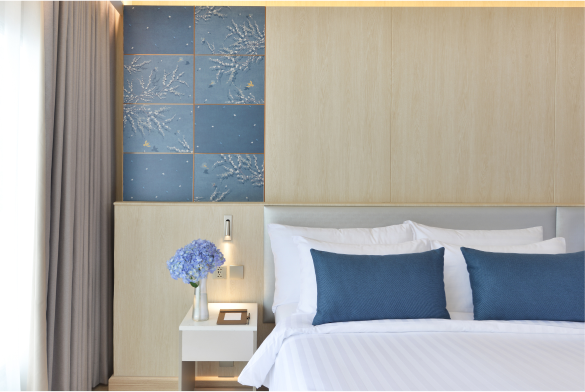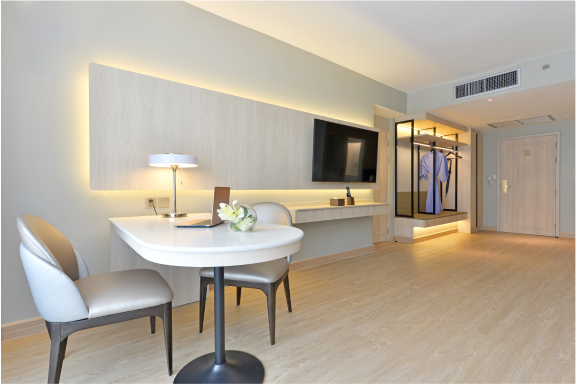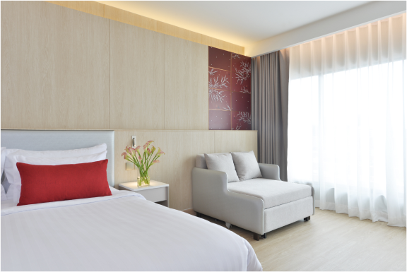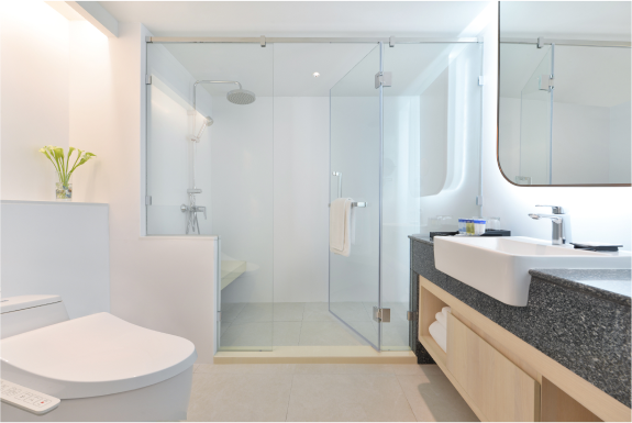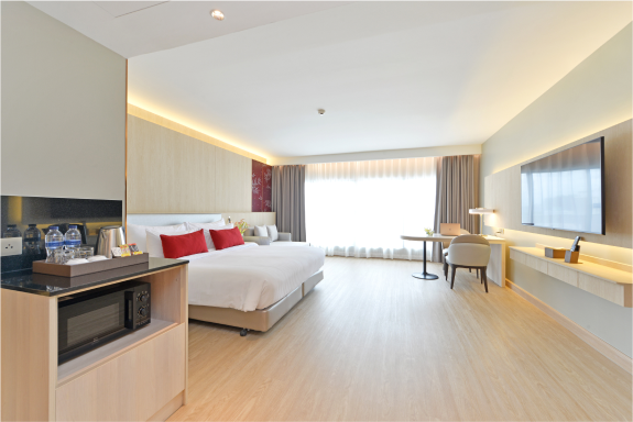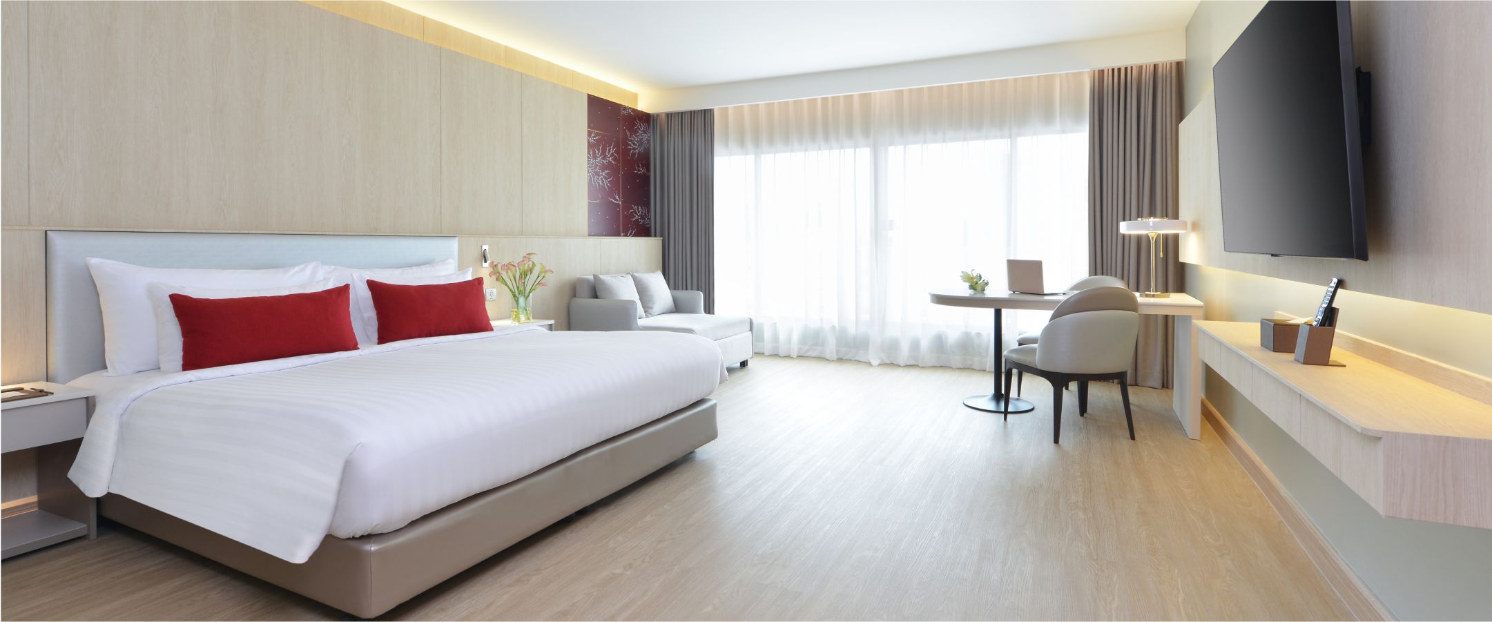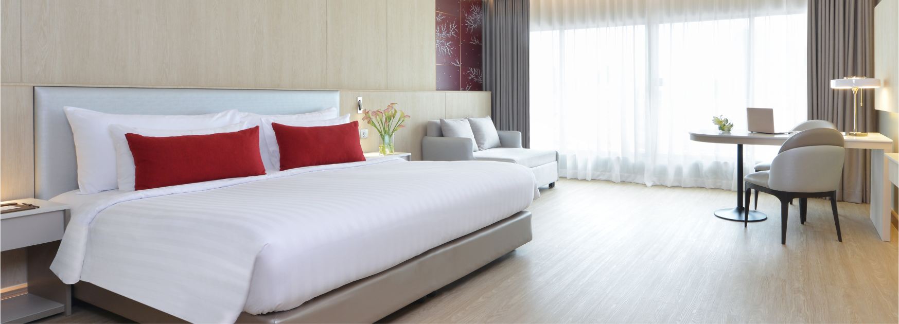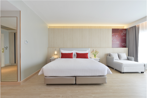 Our Grand Deluxe Rooms are purposefully designed for a light and bright stay. With a spacious 47 square meter layout, there is ample room to spread out and enjoy your time in Bangkok. The clean and comfortable environment within these rooms makes this the perfect choice for a dust-free environment, promoting a healthy stay. The space in our Grand Deluxe Rooms affords the opportunity to add additional bedding to make your accommodation complete. Each room comes with a private balcony, stylish ensuite and fantastic city views.