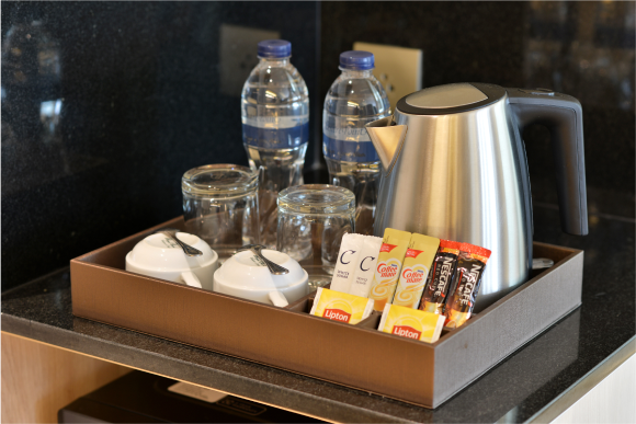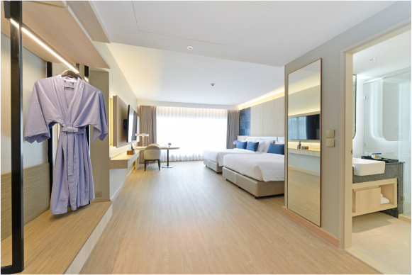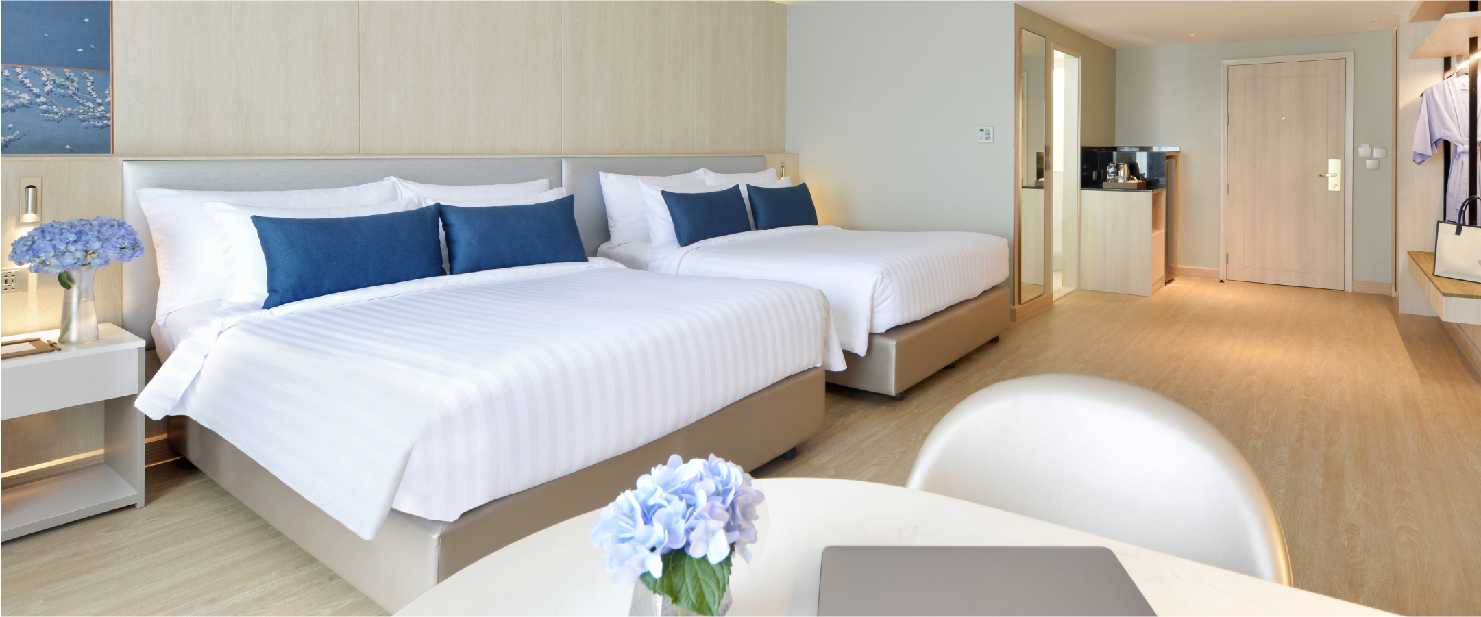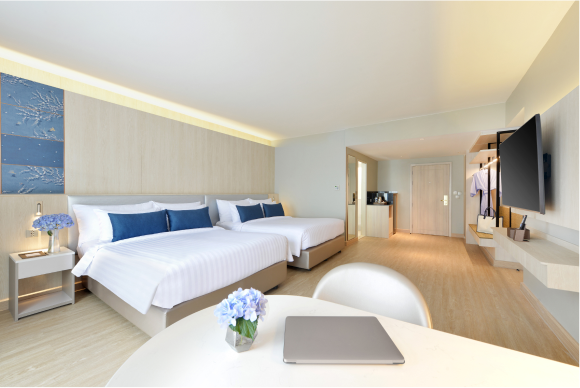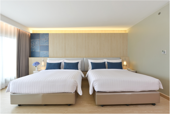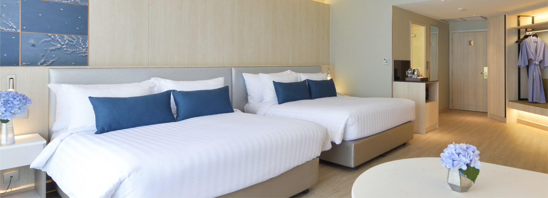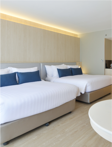 The Grand Deluxe Room for 3-4 adults is the perfect choice for those looking for a little more bedding space. The two king-size beds within these rooms make them a comfortable choice for twin accommodation or a fantastic choice to accommodate up to 4 adults in two separate beds. The modern amenities are presented within a clean, dust-free environment to complete the picture of the perfect accommodation in the Pratunam area. Each room includes free and fast WIFI, daily drinking water, a comfortable table area, a refrigerator and a microwave to ensure that every convenience is delivered.